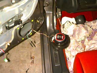 Woofer connected, but not yet mounted. The standard wire is pretty bad so I used the wire supplied with the Sony speakers and threaded it through the rubber tubing between the door and body of the vehicle. This was no easy task and involved securing the speaker wire to a piece of stiff wire (actually a butchered coat hanger) and carefully forcing it through the rubber tubing. You can put your hand between the door and body and help guide it through the tube and into the body of the vehicle. Take your time! |