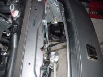 What I did is mount a relay where the stock horn was and use the wire to the original horn to trigger the relay. Then I ran a +'ve lead (RED) directly from the battery (with an inline fuse) to one side of the relay and a switched lead (blue) from the other side to each of the horns. The relay and both horns are grounded to the bolt that holds them.